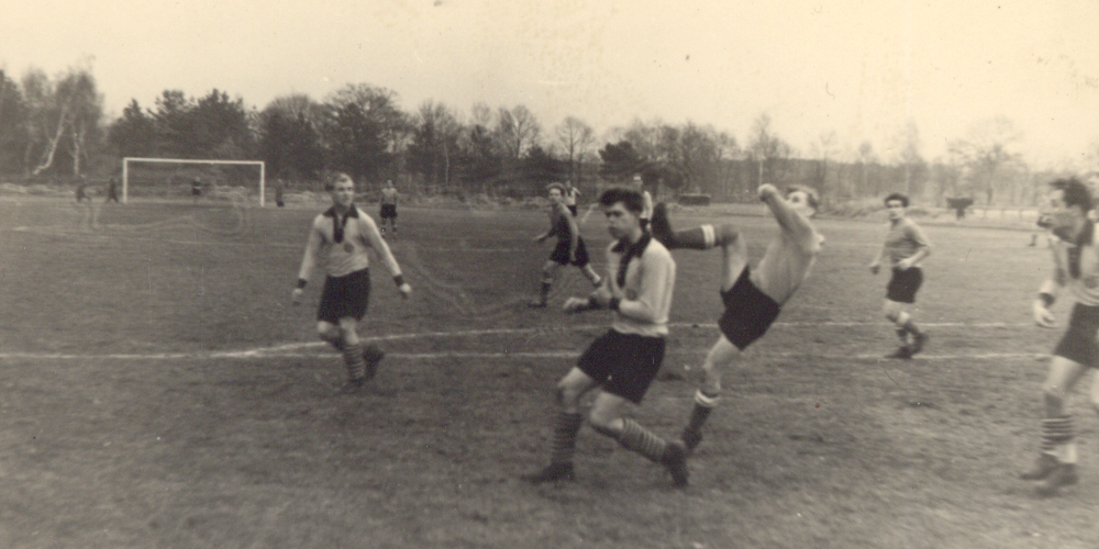 Im selben Spiel beobachtet der junge Jürgen Lange die Aktion des Torwarts. Hinten in der Mitte schaut Spielertrainer Günther Heitepriem kritisch zu.